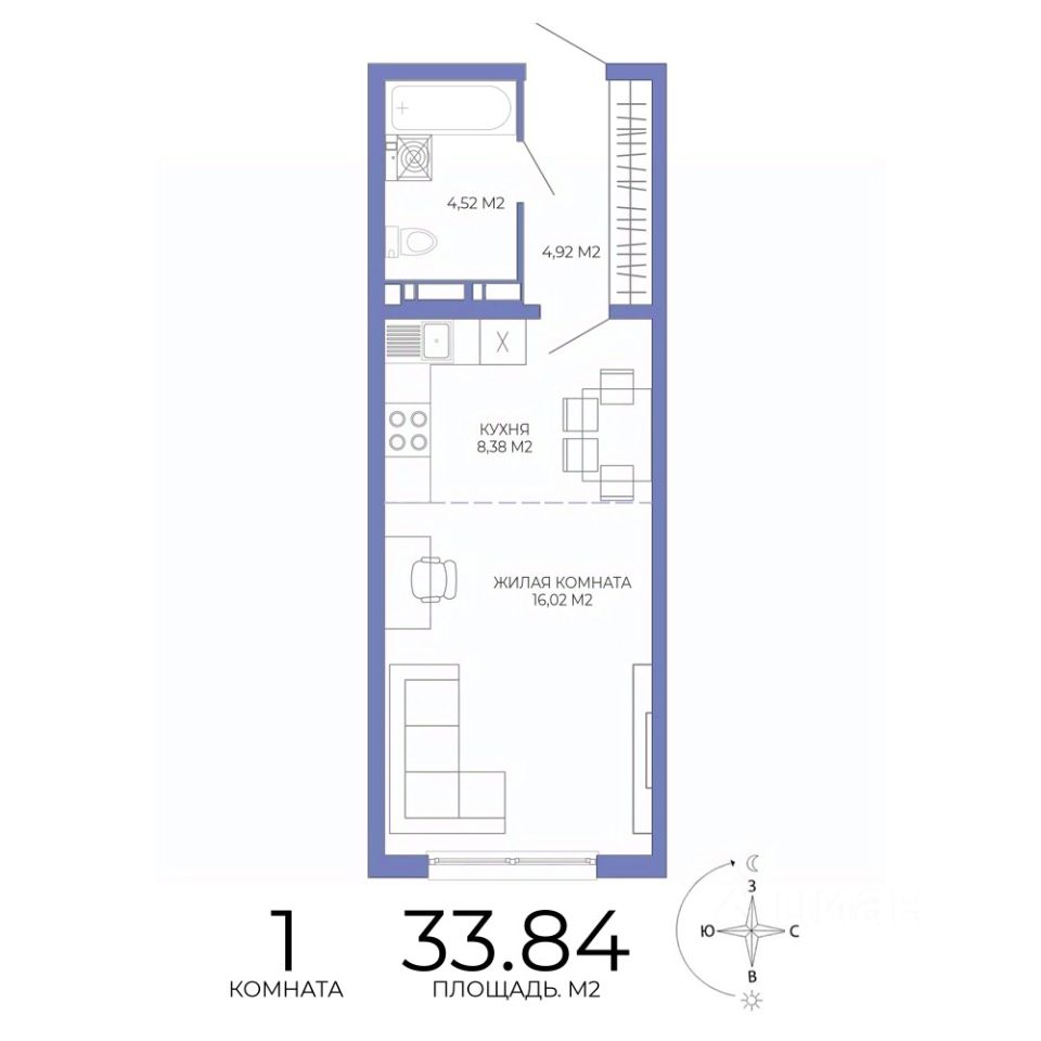 Продаётся 1-комнатная квартира в строящемся доме (дом 1), срок сдачи: II-кв. 2027, общей площадью 33.84 кв.м., на 12 этаже. Дизайнерская отделка.