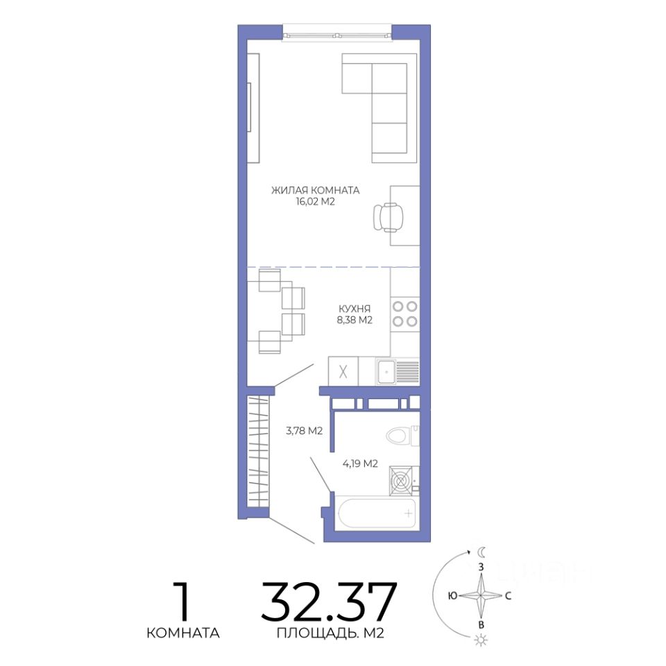 Продаётся 1-комнатная квартира в строящемся доме (дом 1), срок сдачи: II-кв. 2027, общей площадью 32.37 кв.м., на 13 этаже. Дизайнерская отделка.