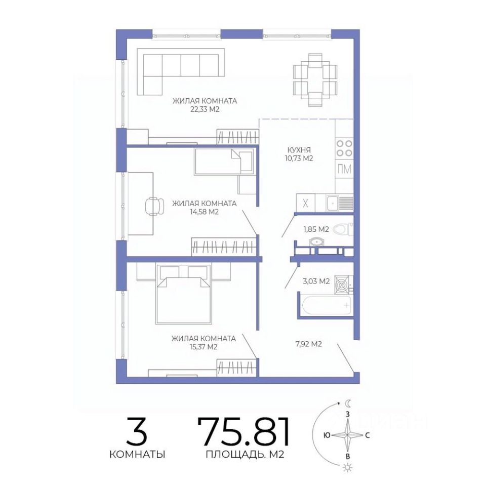 Продаётся 3-комнатная квартира в строящемся доме (дом 1), срок сдачи: II-кв. 2027, общей площадью 75.81 кв.м., на 14 этаже. Дизайнерская отделка.