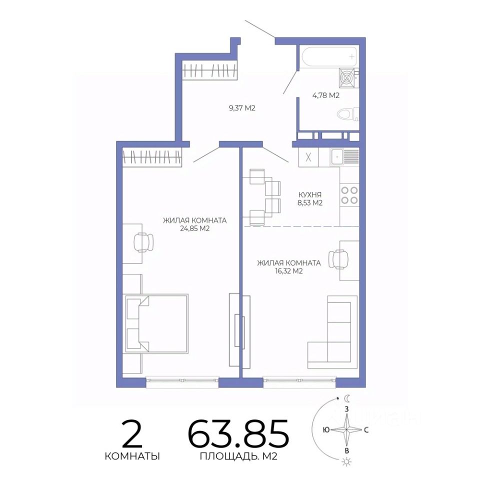 Продаётся 2-комнатная квартира в строящемся доме (дом 1), срок сдачи: II-кв. 2027, общей площадью 63.85 кв.м., на 15 этаже. Дизайнерская отделка.