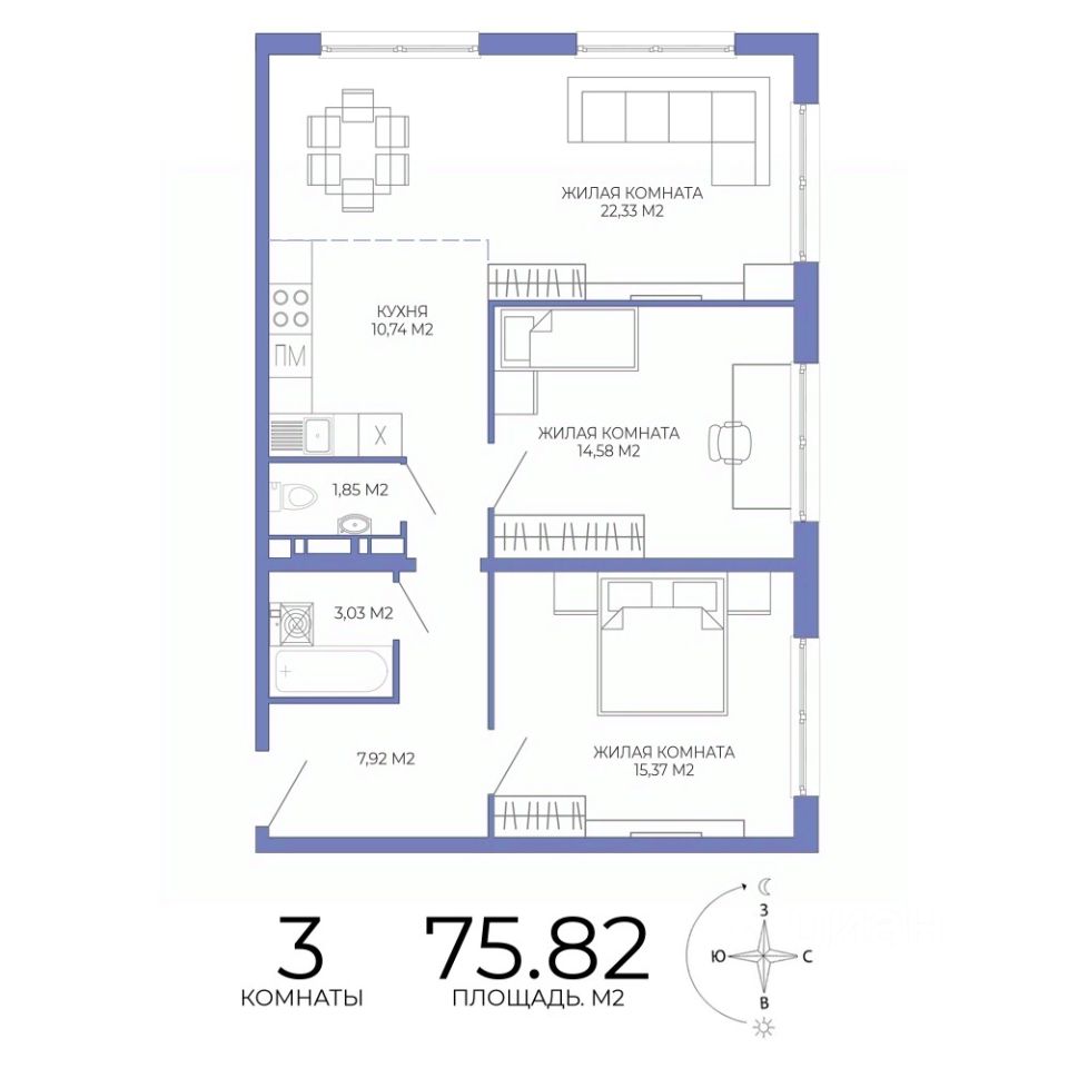 Продаётся 3-комнатная квартира в строящемся доме (дом 1), срок сдачи: II-кв. 2027, общей площадью 75.82 кв.м., на 16 этаже. Дизайнерская отделка.
