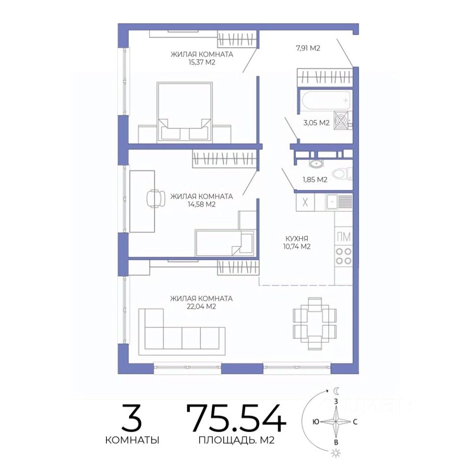 Продаётся 3-комнатная квартира в строящемся доме (дом 1), срок сдачи: II-кв. 2027, общей площадью 75.54 кв.м., на 4 этаже. Дизайнерская отделка.