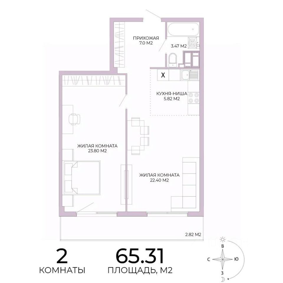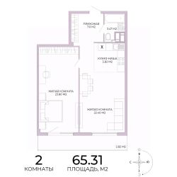 Продаётся 2-комнатная квартира в строящемся доме (дом 17), срок сдачи: IV-кв. 2025, общей площадью 65.31 кв.м., на 6 этаже. Дизайнерская отделка.