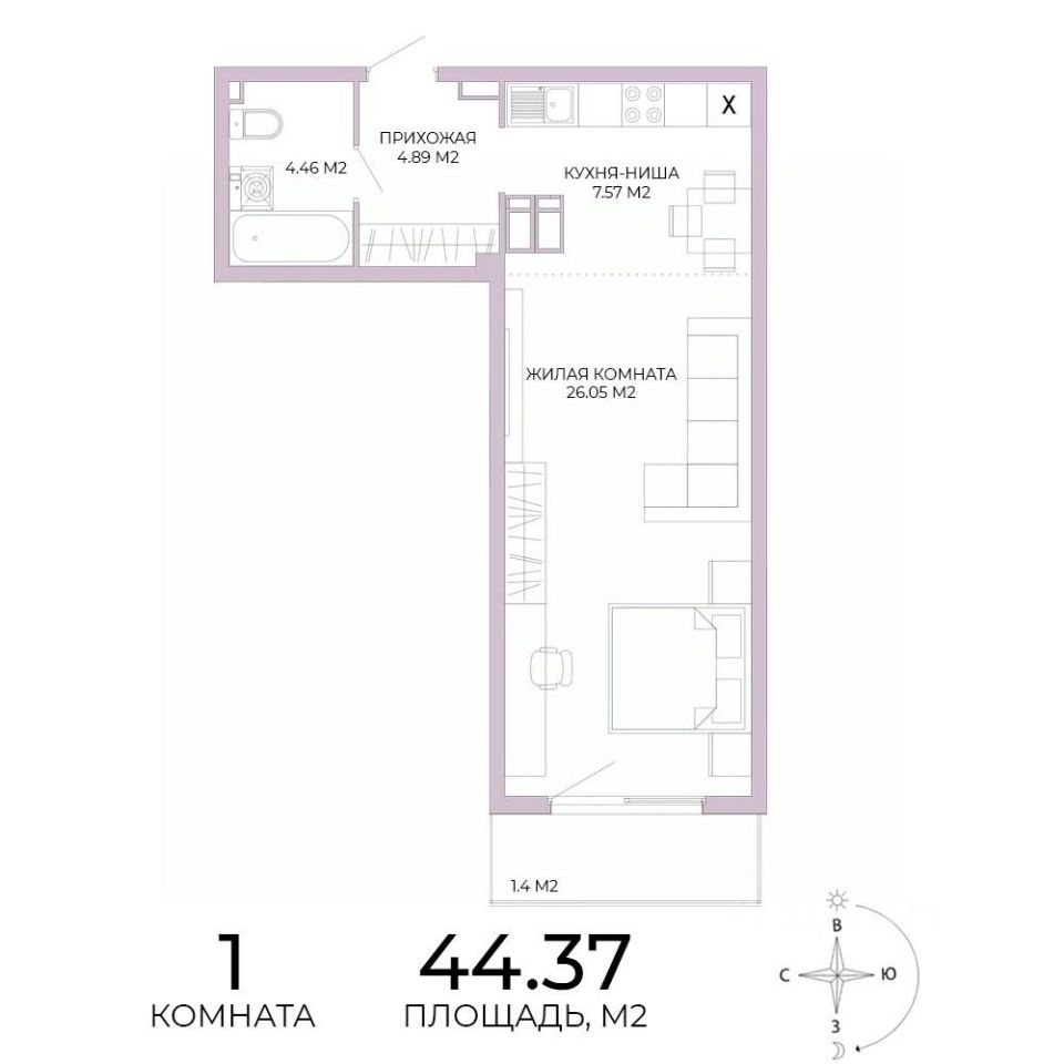 Продаётся 1-комнатная квартира в сданном доме (дом 17), срок сдачи: IV-кв. 2025, общей площадью 44.37 кв.м., на 6 этаже. Дизайнерская отделка.