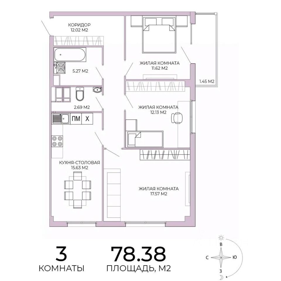 Продаётся 3-комнатная квартира в строящемся доме (дом 17), срок сдачи: IV-кв. 2025, общей площадью 78.38 кв.м., на 9 этаже. Дизайнерская отделка.