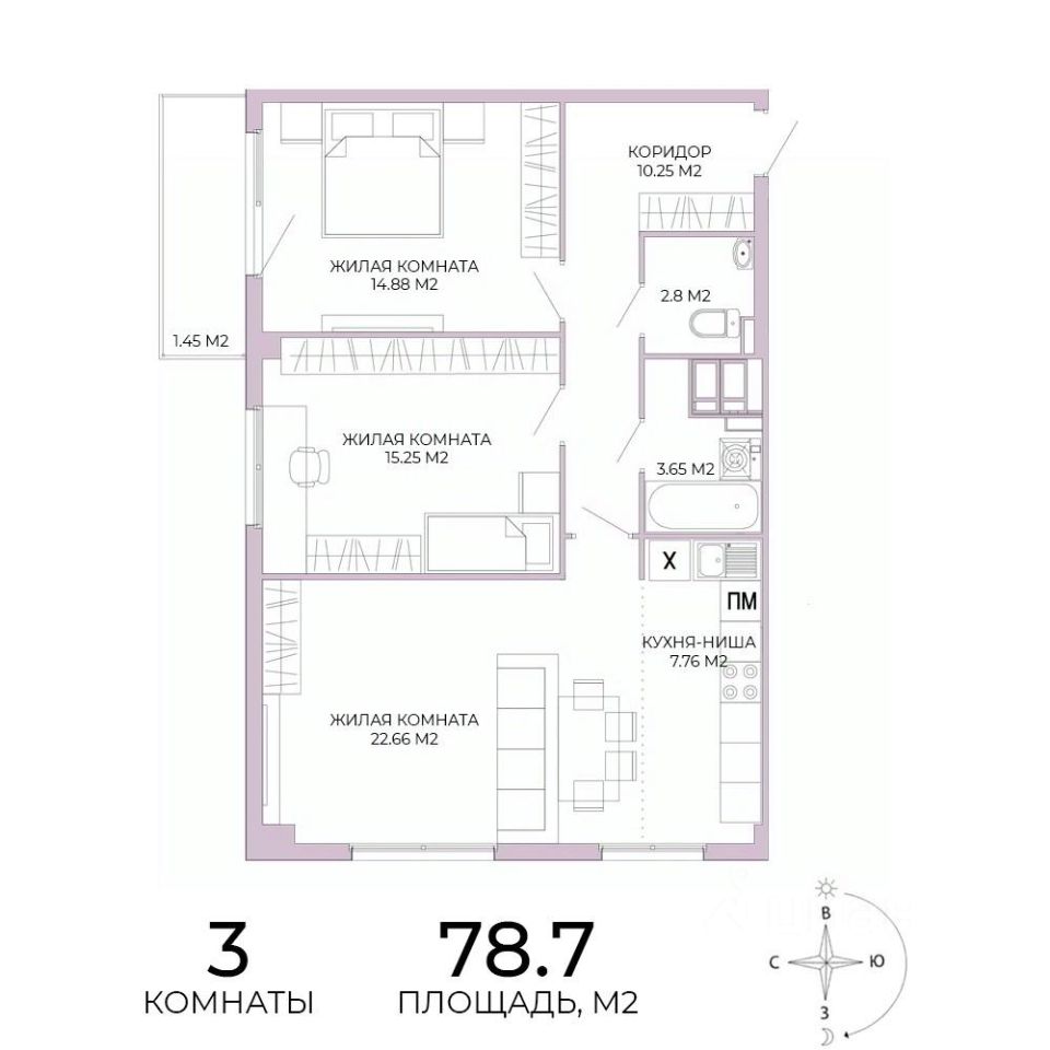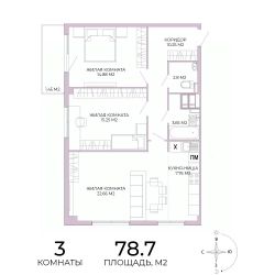 Продаётся 3-комнатная квартира в строящемся доме (дом 17), срок сдачи: IV-кв. 2025, общей площадью 78.7 кв.м., на 2 этаже. Дизайнерская отделка.