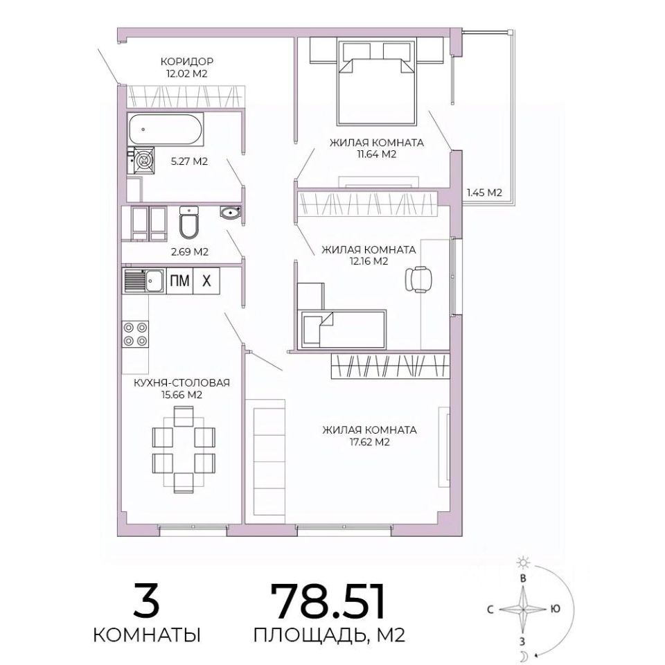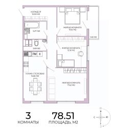 Продаётся 3-комнатная квартира в строящемся доме (дом 17), срок сдачи: IV-кв. 2025, общей площадью 78.51 кв.м., на 12 этаже. Дизайнерская отделка.
