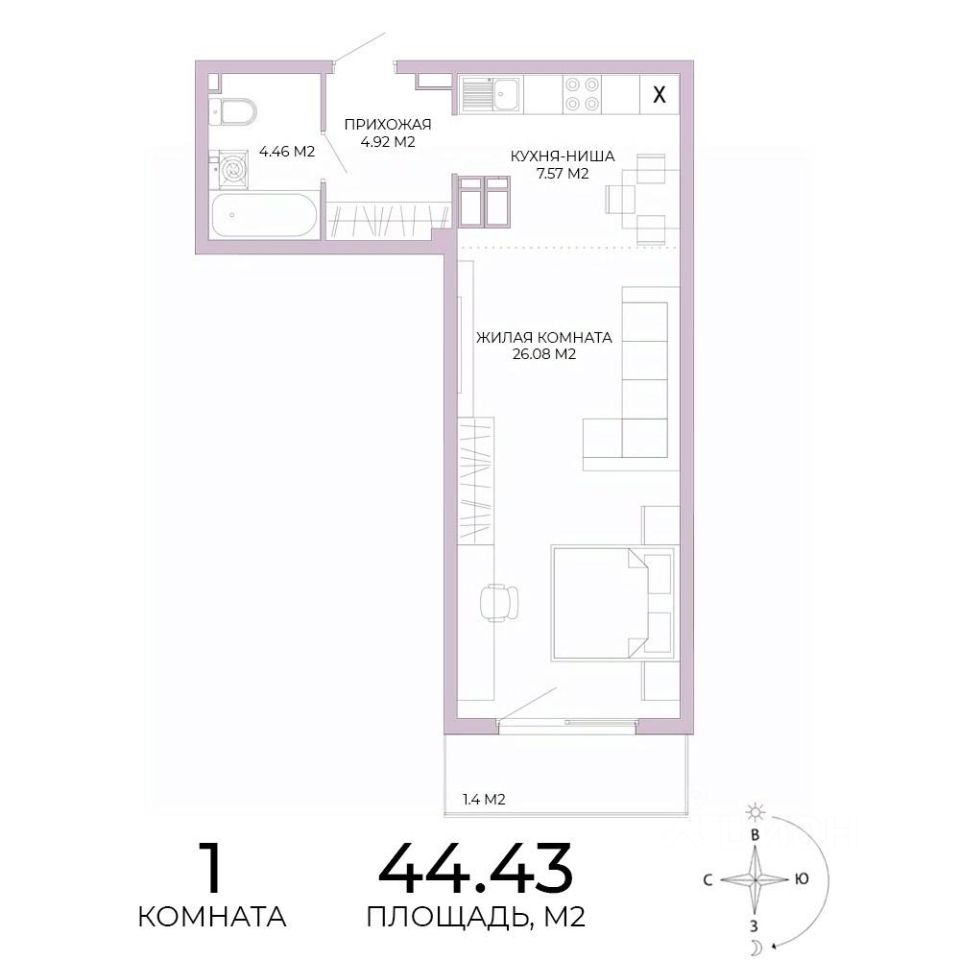 Продаётся 1-комнатная квартира в строящемся доме (дом 17), срок сдачи: IV-кв. 2025, общей площадью 44.43 кв.м., на 14 этаже. Дизайнерская отделка.