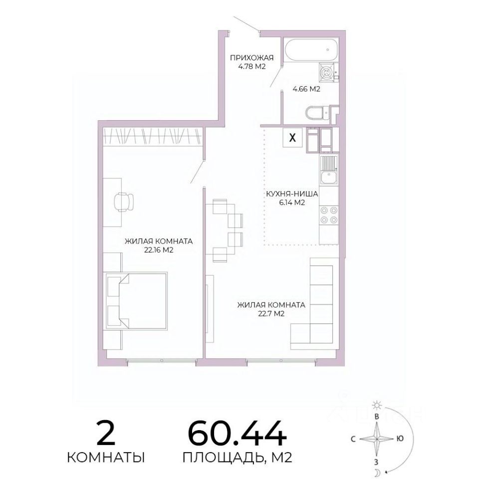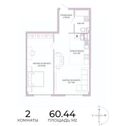 Продаётся 2-комнатная квартира в строящемся доме (дом 17), срок сдачи: IV-кв. 2025, общей площадью 60.44 кв.м., на 17 этаже. Дизайнерская отделка.