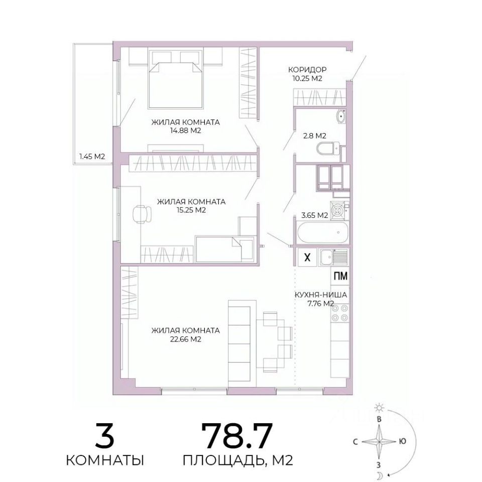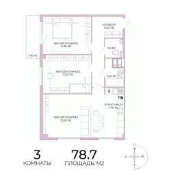 Продаётся 3-комнатная квартира в строящемся доме (дом 17), срок сдачи: IV-кв. 2025, общей площадью 78.7 кв.м., на 3 этаже. Дизайнерская отделка.