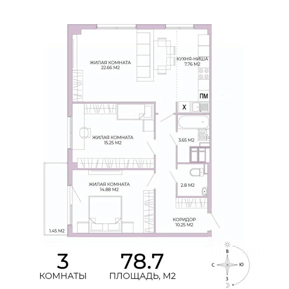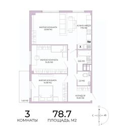 Продаётся 3-комнатная квартира в строящемся доме (дом 17), срок сдачи: IV-кв. 2025, общей площадью 78.7 кв.м., на 3 этаже. Дизайнерская отделка.