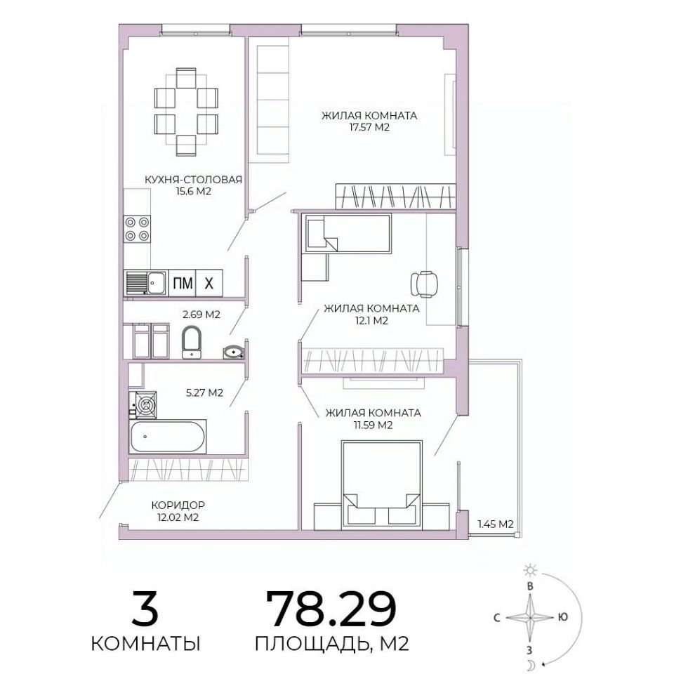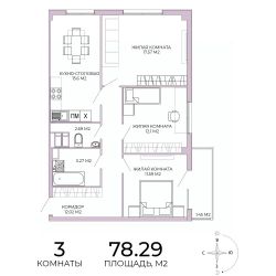 Продаётся 3-комнатная квартира в строящемся доме (дом 17), срок сдачи: IV-кв. 2025, общей площадью 78.29 кв.м., на 4 этаже. Дизайнерская отделка.