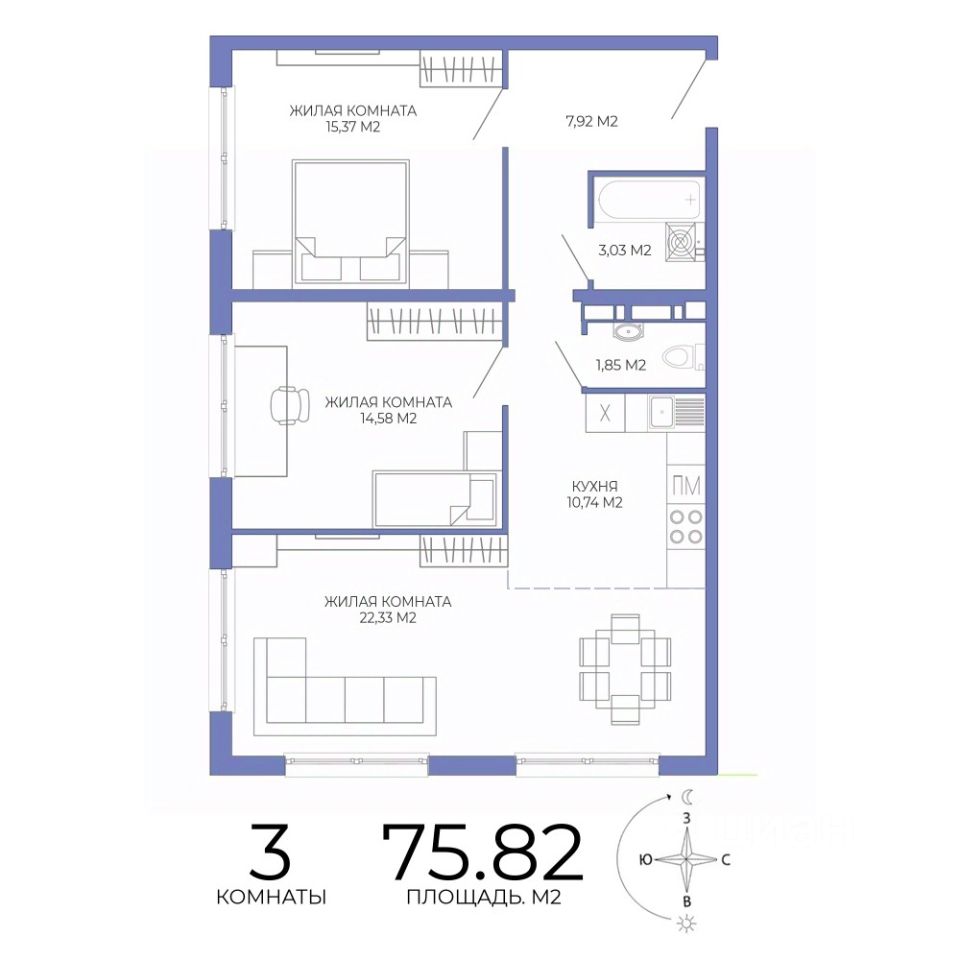 Продаётся 3-комнатная квартира в строящемся доме (дом 2), срок сдачи: II-кв. 2027, общей площадью 75.82 кв.м., на 8 этаже. Дизайнерская отделка.