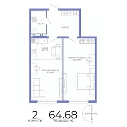 Продаётся 2-комнатная квартира в строящемся доме (дом 2), срок сдачи: II-кв. 2027, общей площадью 64.68 кв.м., на 11 этаже. Дизайнерская отделка.