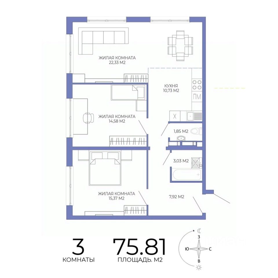 Продаётся 3-комнатная квартира в строящемся доме (дом 2), срок сдачи: II-кв. 2027, общей площадью 75.81 кв.м., на 11 этаже. Дизайнерская отделка.