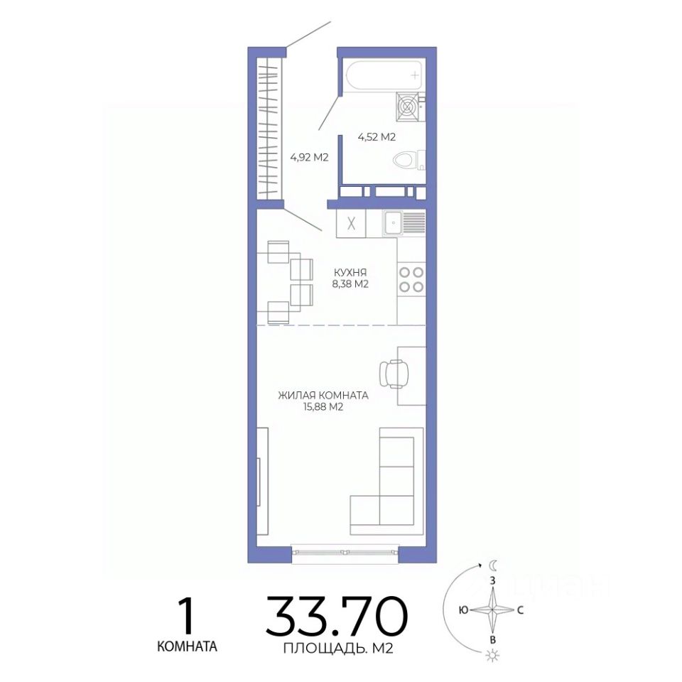 Продаётся 1-комнатная квартира в строящемся доме (дом 2), срок сдачи: II-кв. 2027, общей площадью 33.7 кв.м., на 3 этаже. Дизайнерская отделка.