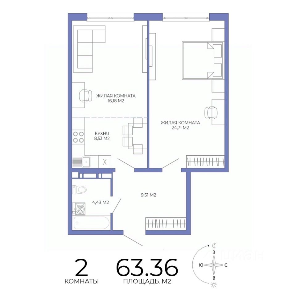 Продаётся 2-комнатная квартира в строящемся доме (дом 2), срок сдачи: II-кв. 2027, общей площадью 63.36 кв.м., на 5 этаже. Дизайнерская отделка.