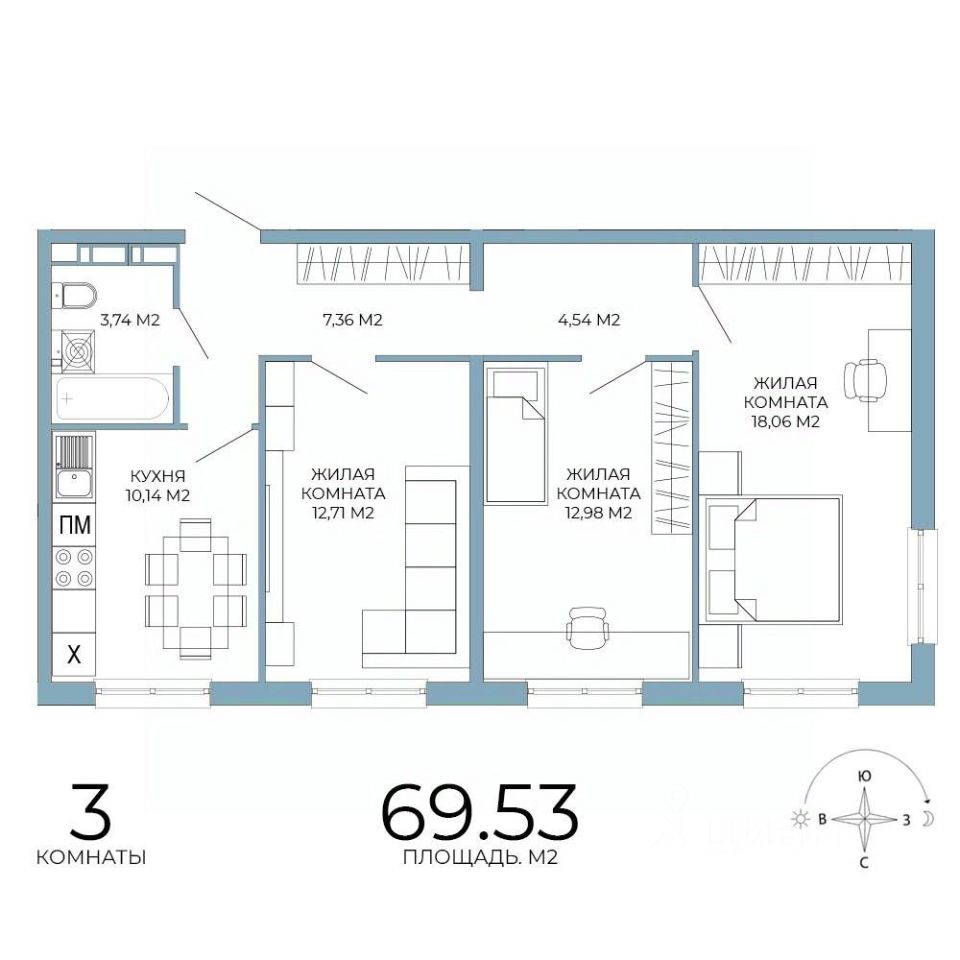 Продаётся 3-комнатная квартира в строящемся доме (дом 5), срок сдачи: III-кв. 2026, общей площадью 69.53 кв.м., на 4 этаже. Дизайнерская отделка.