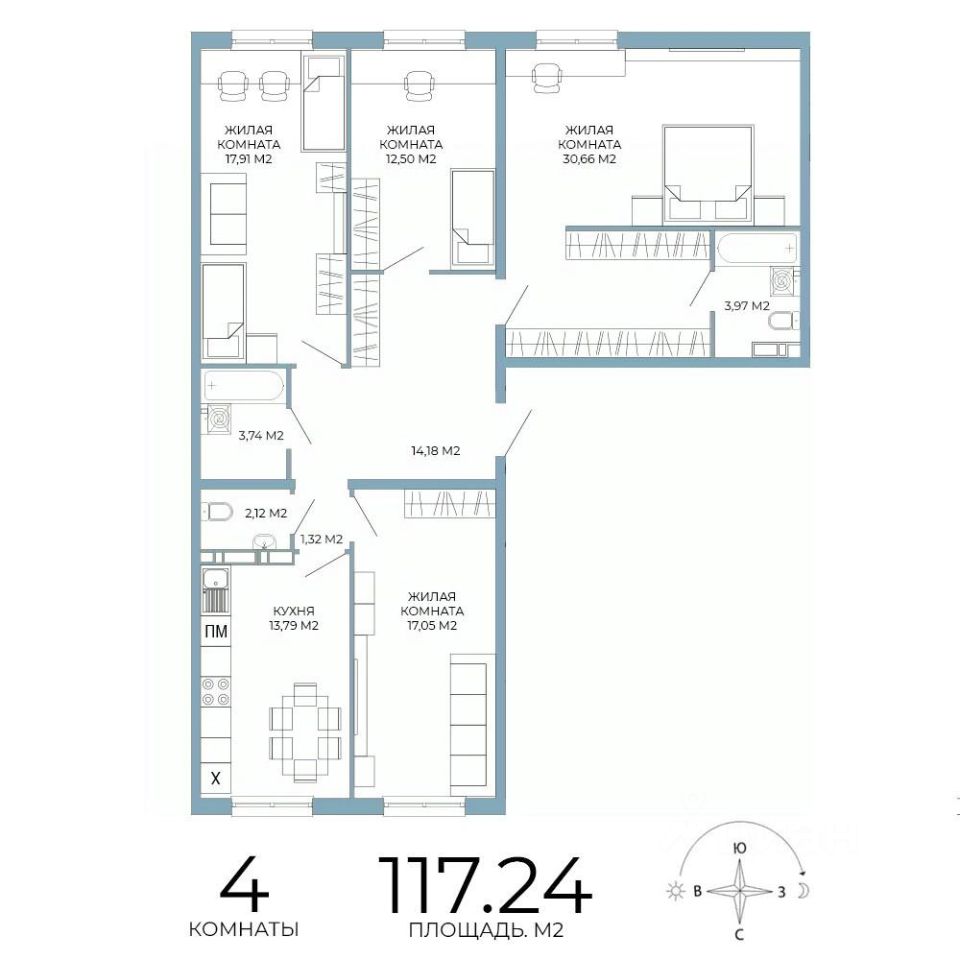Продаётся 4-комнатная квартира в строящемся доме (дом 5), срок сдачи: III-кв. 2026, общей площадью 117.24 кв.м., на 5 этаже. Дизайнерская отделка.