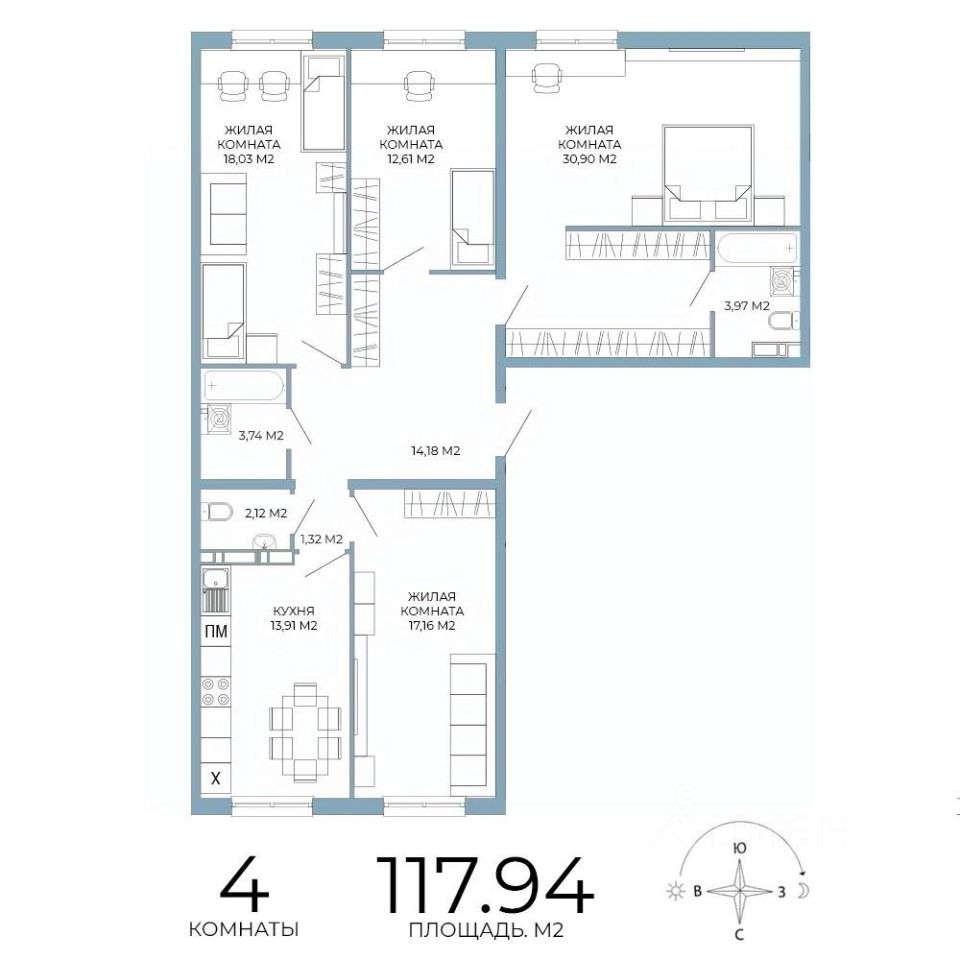 Продаётся 4-комнатная квартира в строящемся доме (дом 5), срок сдачи: III-кв. 2026, общей площадью 117.94 кв.м., на 13 этаже. Дизайнерская отделка.