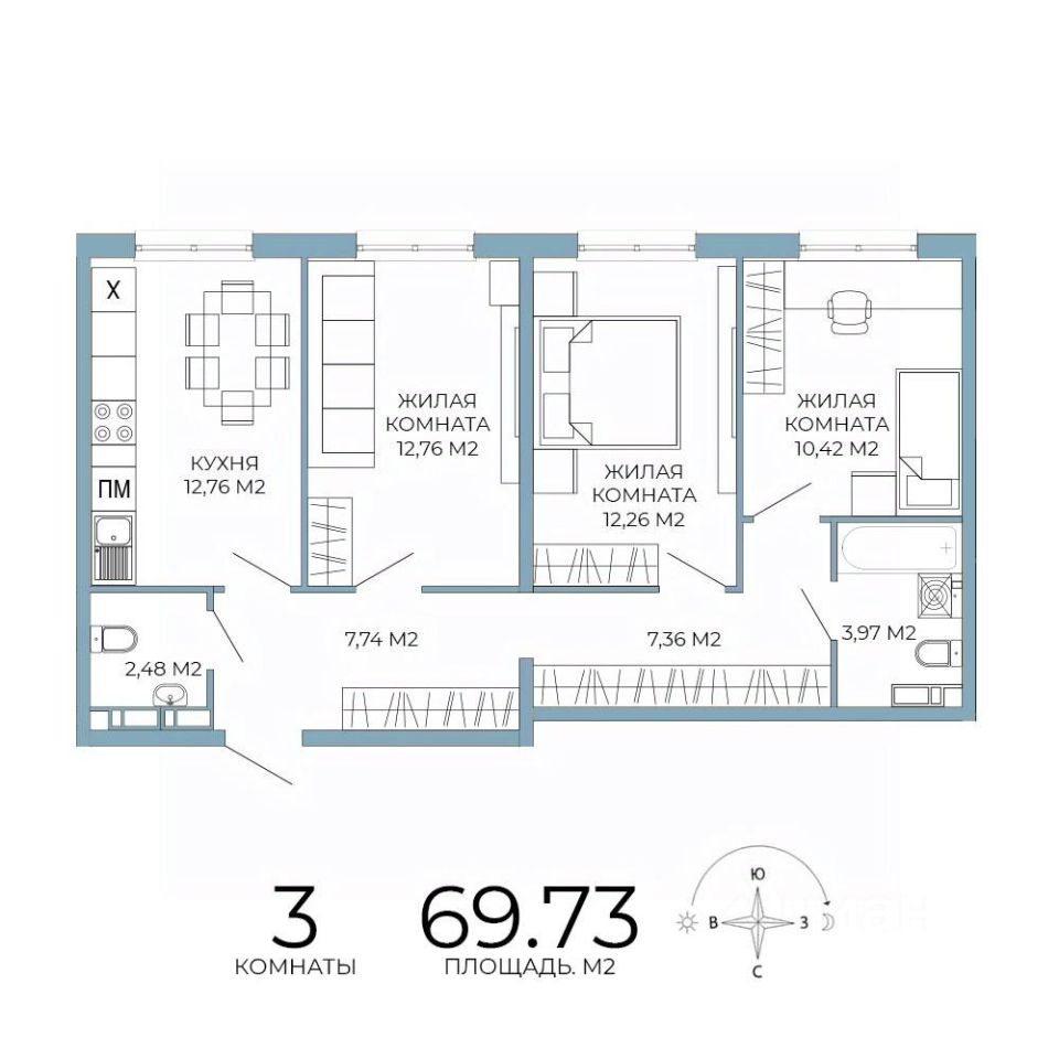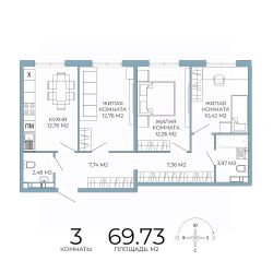 Продаётся 3-комнатная квартира в строящемся доме (дом 5), срок сдачи: III-кв. 2026, общей площадью 69.73 кв.м., на 2 этаже. Дизайнерская отделка.