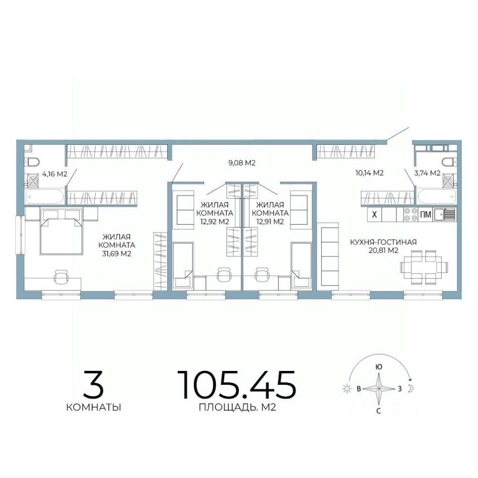 Продаётся 3-комнатная квартира в строящемся доме (дом 5), срок сдачи: III-кв. 2026, общей площадью 105.45 кв.м., на 9 этаже. Дизайнерская отделка.