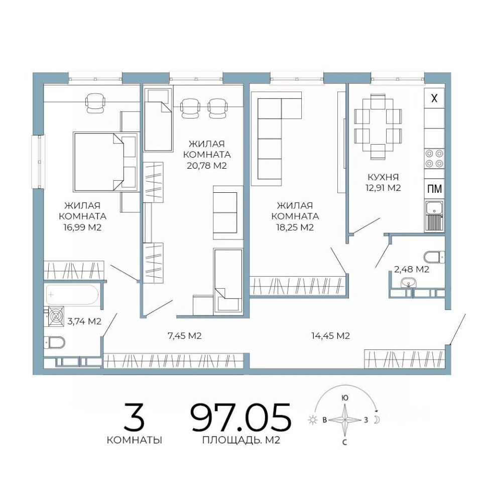 Продаётся 3-комнатная квартира в строящемся доме (дом 5), срок сдачи: III-кв. 2026, общей площадью 97.05 кв.м., на 13 этаже. Дизайнерская отделка.