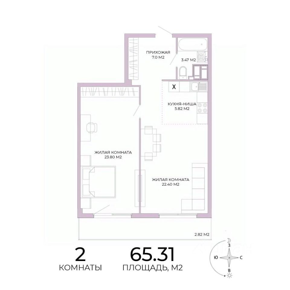 Продаётся 2-комнатная квартира в сданном доме (дом 18), срок сдачи: IV-кв. 2025, общей площадью 65.31 кв.м., на 6 этаже. Дизайнерская отделка.
