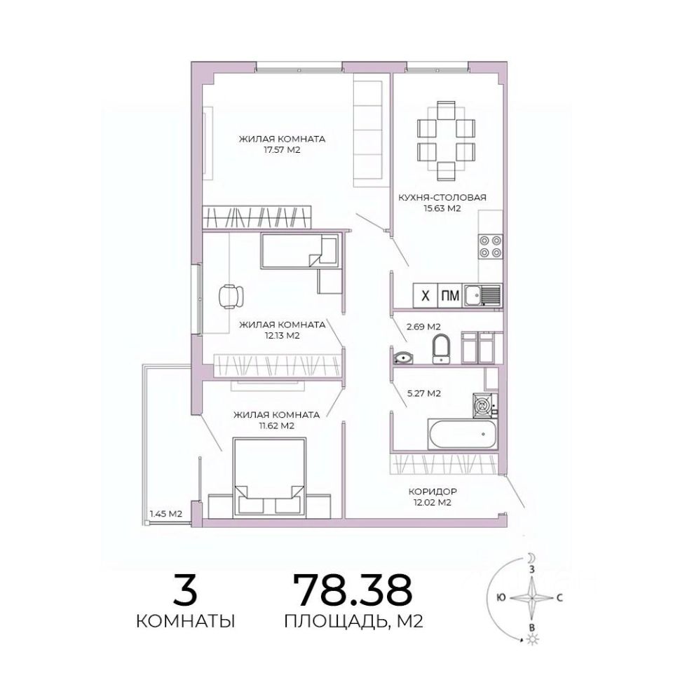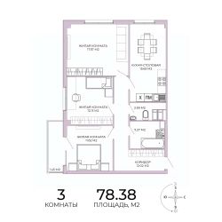 Продаётся 3-комнатная квартира в строящемся доме (дом 18), срок сдачи: IV-кв. 2025, общей площадью 78.38 кв.м., на 7 этаже. Дизайнерская отделка.