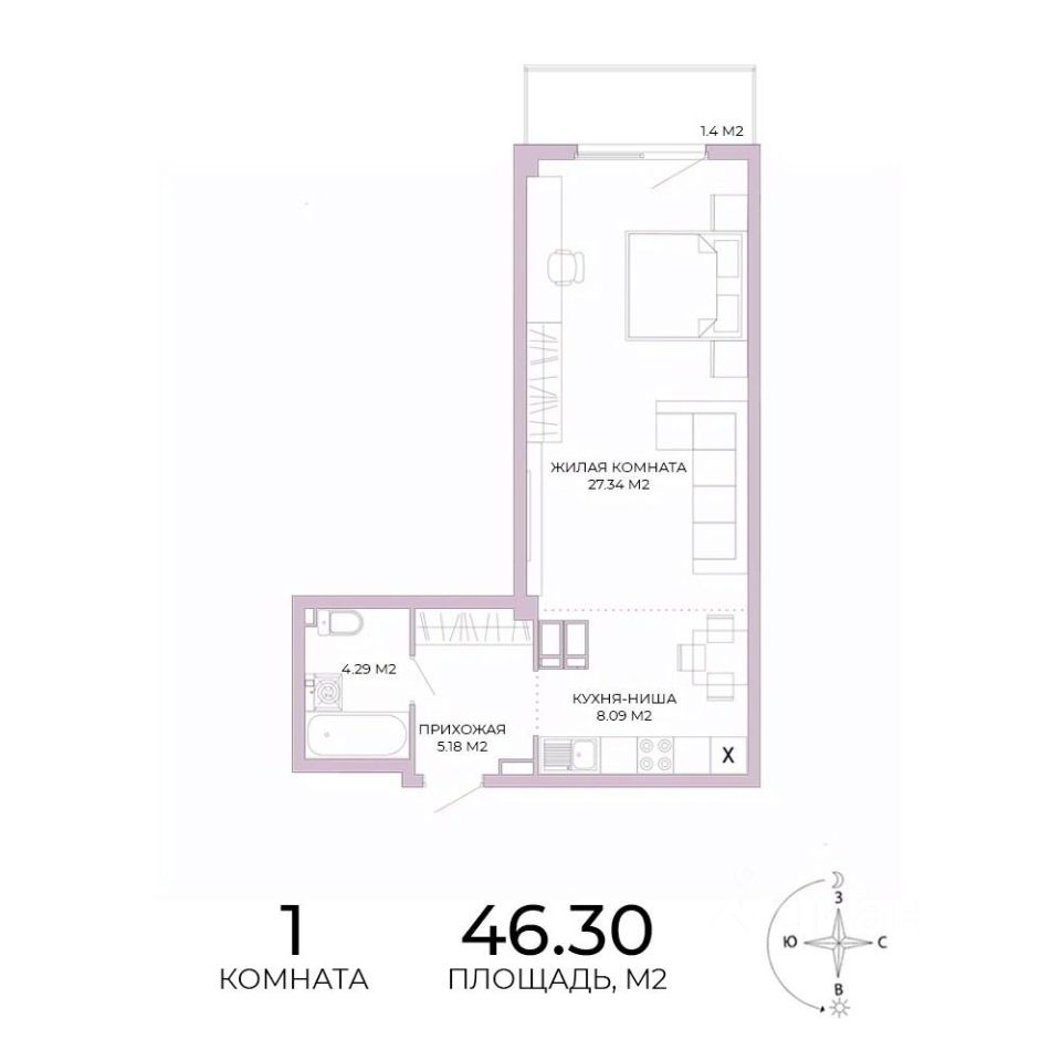 Продаётся 1-комнатная квартира в сданном доме (дом 18), срок сдачи: IV-кв. 2025, общей площадью 46.3 кв.м., на 8 этаже. Дизайнерская отделка.