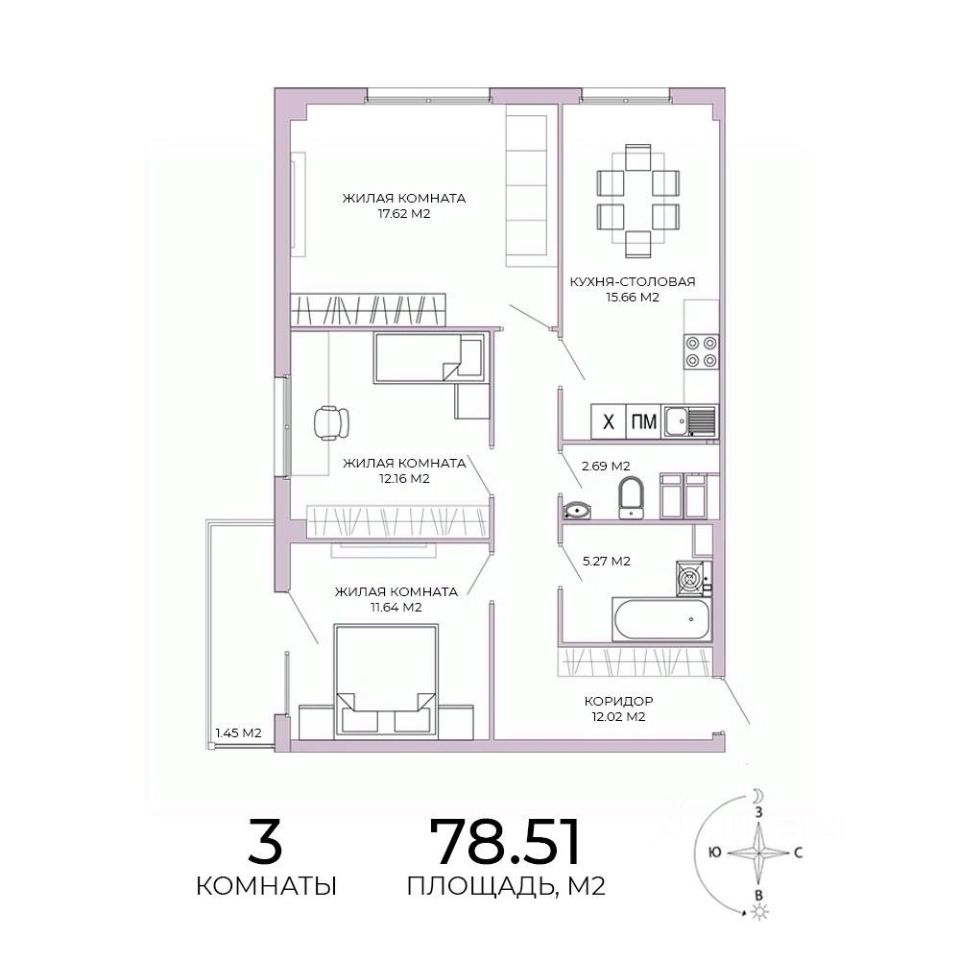 Продаётся 3-комнатная квартира в строящемся доме (дом 18), срок сдачи: IV-кв. 2025, общей площадью 78.51 кв.м., на 15 этаже. Дизайнерская отделка.