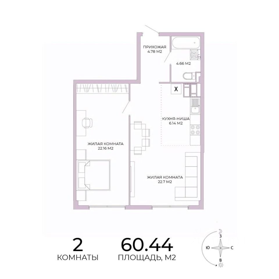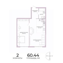Продаётся 2-комнатная квартира в строящемся доме (дом 18), срок сдачи: IV-кв. 2025, общей площадью 60.44 кв.м., на 17 этаже. Дизайнерская отделка.