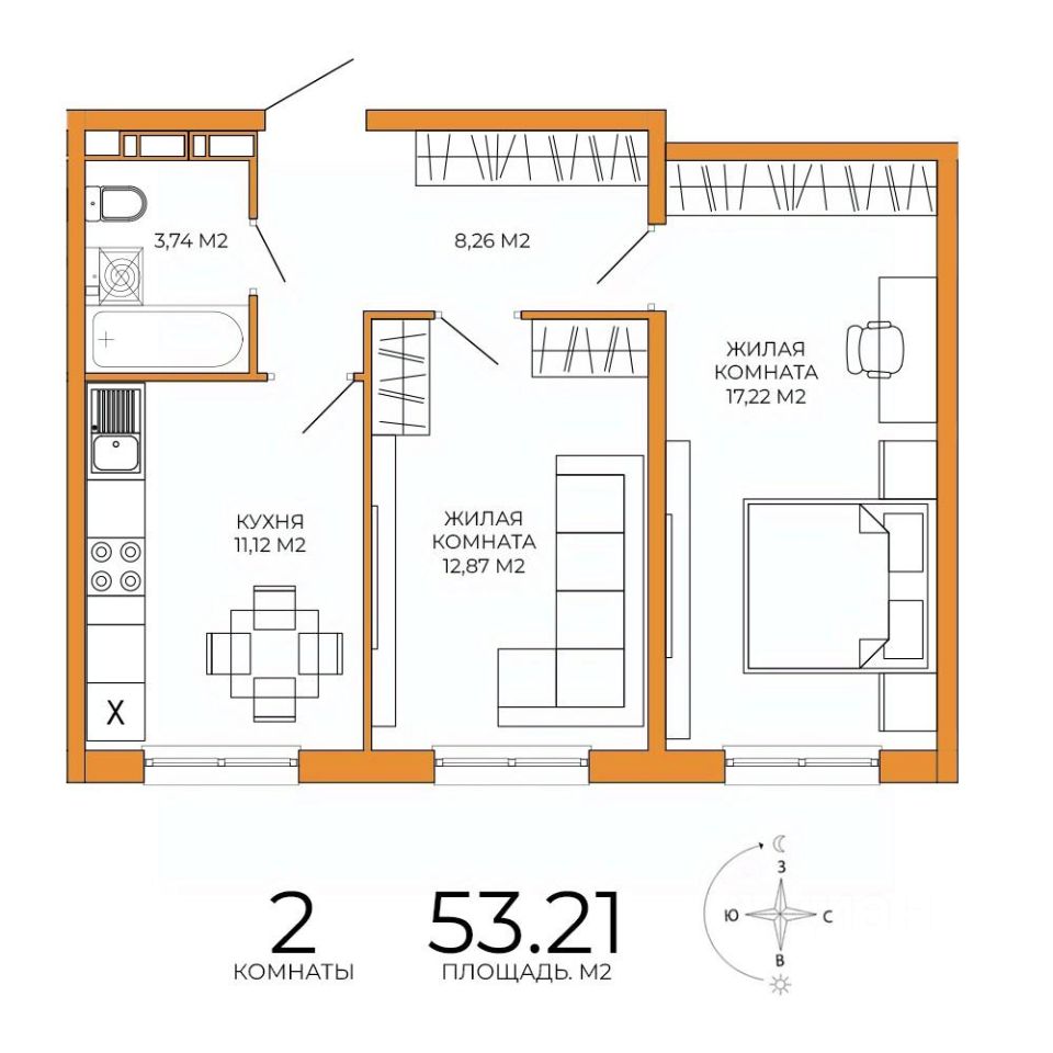Продаётся 2-комнатная квартира в сданном доме (дом 10), срок сдачи: IV-кв. 2024, общей площадью 53.21 кв.м., на 11 этаже. Дизайнерская отделка.