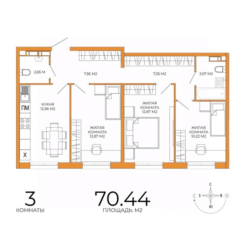 Продаётся 3-комнатная квартира в сданном доме (дом 10), срок сдачи: IV-кв. 2024, общей площадью 70.44 кв.м., на 6 этаже. Дизайнерская отделка.