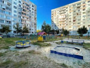 Двор большой и зеленый, есть замечательная детская площадка, оснащенная разнообразными игровыми элементами.