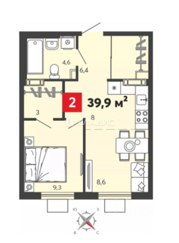 Спальня: 9.3 + 3 кв.м гардеробное помещение.