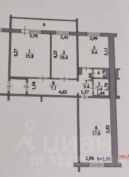 Жилая площадь 43,8 м2 (17,6+15,8+10,4).