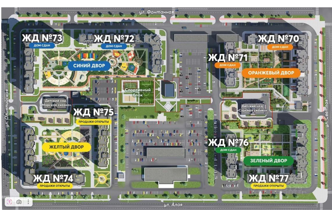 ЖК Радужные дворы — это жилой квартал, в котором все создано для безопасной и яркой жизни: огороженная территория, безопасный двор без машин, продуманные уютные зоны отдыха для всех возрастов, яркая архитектура, спортивные площадки, площадки активности.