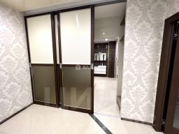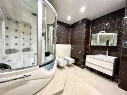 Ремонт осуществлен по дизайн-проекту с использованием материалов высокого качества: итальянская плитка, обои Armani Casa, двухуровневые потолки с различными сценариями освещения. Также в мокрых зонах реализована система теплого пола.