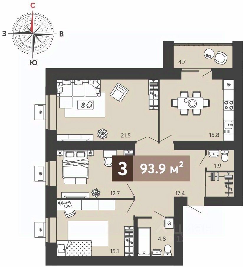 Трехкомнатная квартира от застройщика с предчистовой отделкой в ЖК "Баланс" на 9 этаже. Общая площадь: 93.9 кв.м., жилая: 49.3 кв.м., площадь просторной кухни-столовой: 15.8 кв.м. Квартира угловая, идеально подойдет любителям тишины и панорамных видов. В квартире один балкон, один совмещенный и один раздельный санузел. Высота потолков 2.7 м.
