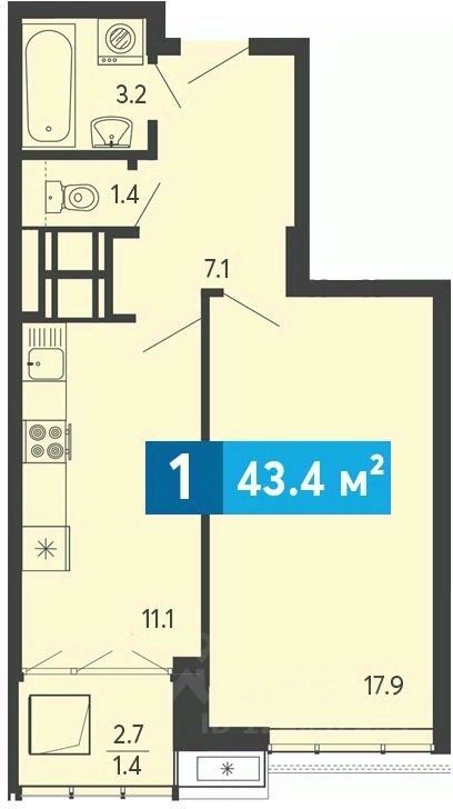 Однокомнатная квартира с предчистовой отделкой в ЖК "Созвездие" на 3 этаже. Общая площадь: 43.4 кв.м., жилая: 17.9 кв.м., площадь просторной кухни-столовой: 11.1 кв.м. Все окна выходят на одну сторону. В квартире одна лоджия, один раздельный санузел. Высота потолков 2.7 м.