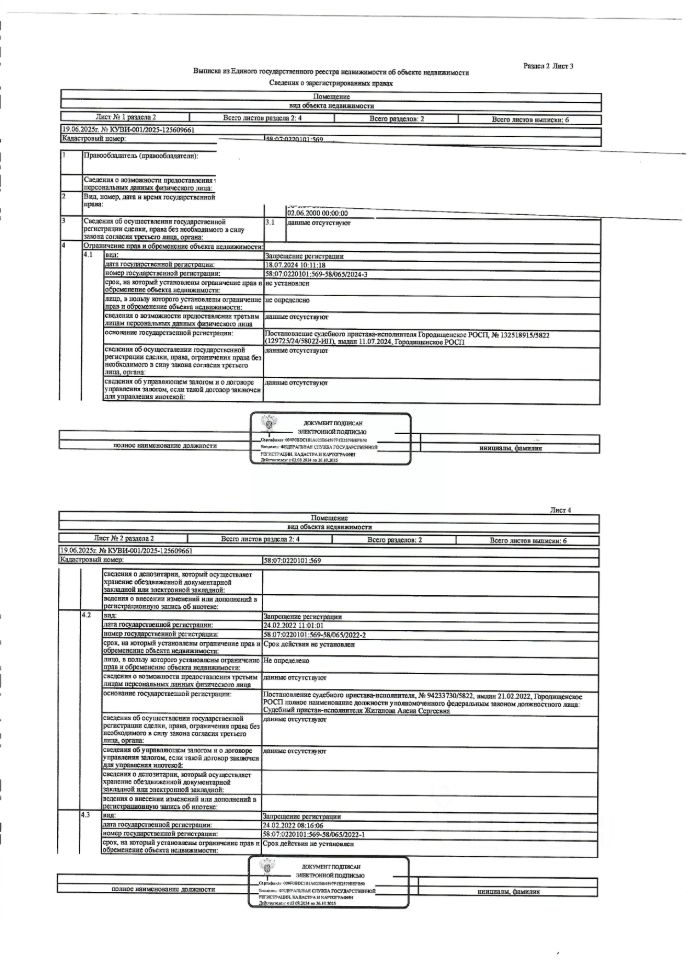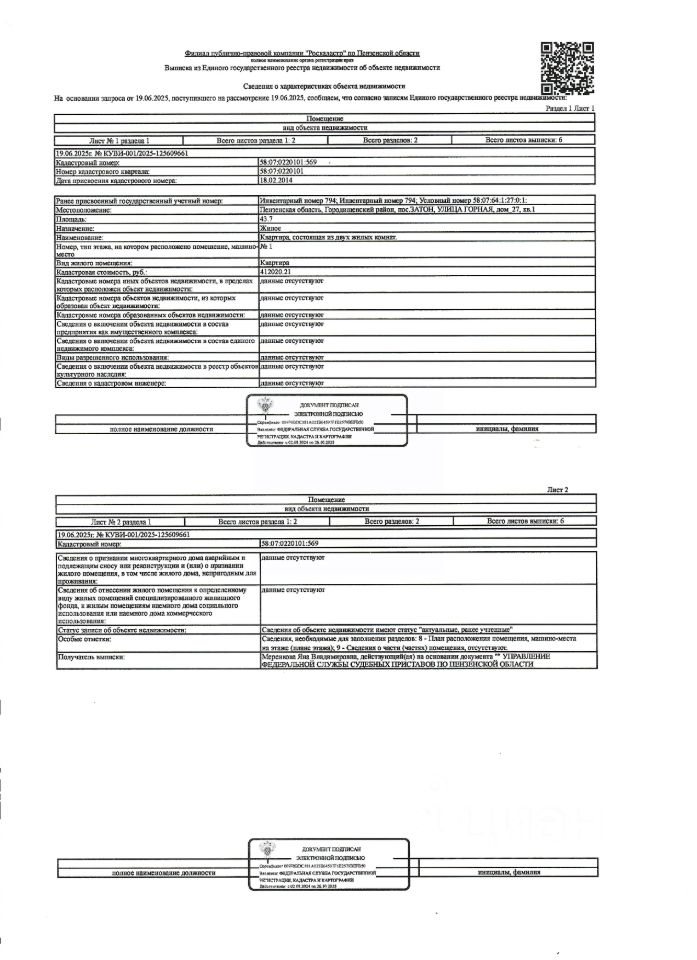 Жилое помещение (квартира 2-х комнатная) общей площадью 43,7 кв.м., кад. 58:07:0220101:569, этаж 01, принадлежащее должнику Мардановой М.М. По месту нахождения объекта зарегистрировано трое граждан. Сведениями о задолженности по коммунальным платежам и взносам на капитальный ремонт, а также о фактическом состоянии объектов недвижимости организатор торгов не располагает. Техническая документация и фотографии объекта отсутствуют у организатора торгов.