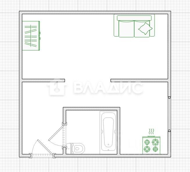 Общая площадь 30,2 кв. м, из которых 18 кв. м — жилая площадь, а 6 кв. м — кухня.