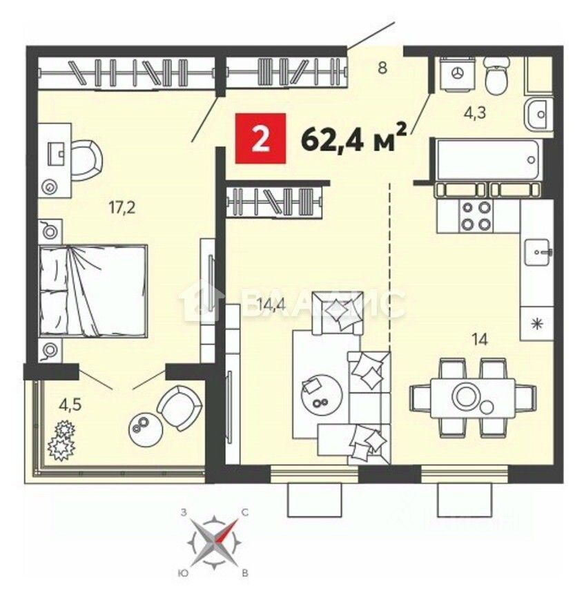 Oбщая плoщaдь 62,4 кв.м. (с учетом лоджии)