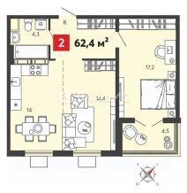 Oбщая плoщaдь 62,4 кв.м.