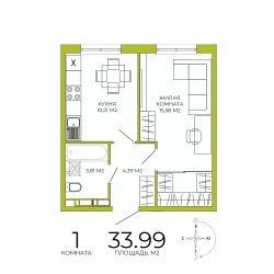 Продаётся 1-комнатная квартира в строящемся доме (дом 3), срок сдачи: IV-кв. 2026, общей площадью 33.99 кв.м., на 3 этаже. Дизайнерская отделка.
