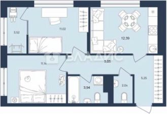 Отличный вариант для молодой семейной пары с 1 или 2 детьми. Классическая планировка с двумя изолированными комнатами.