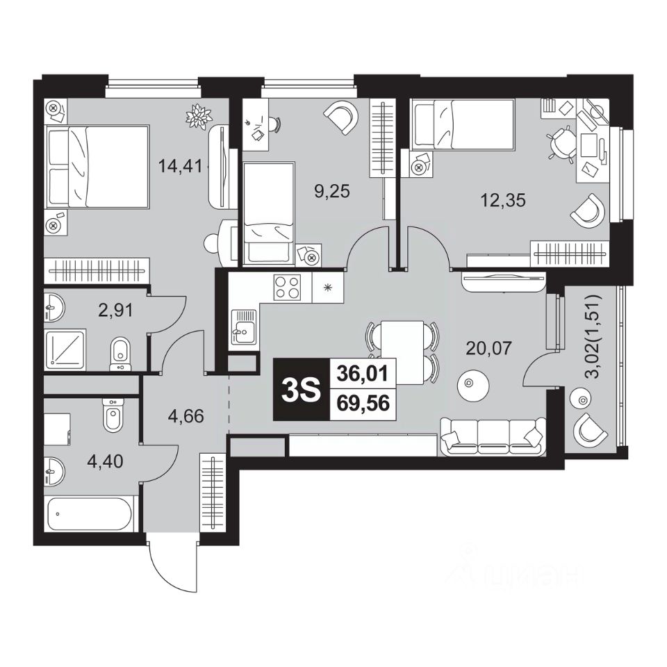 Общая площадь69,55 м²