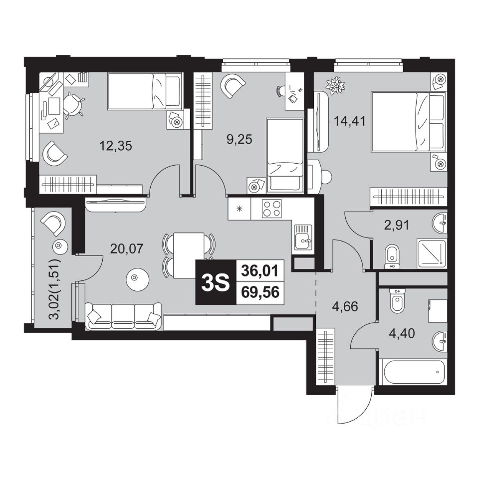 Общая площадь69,56 м²