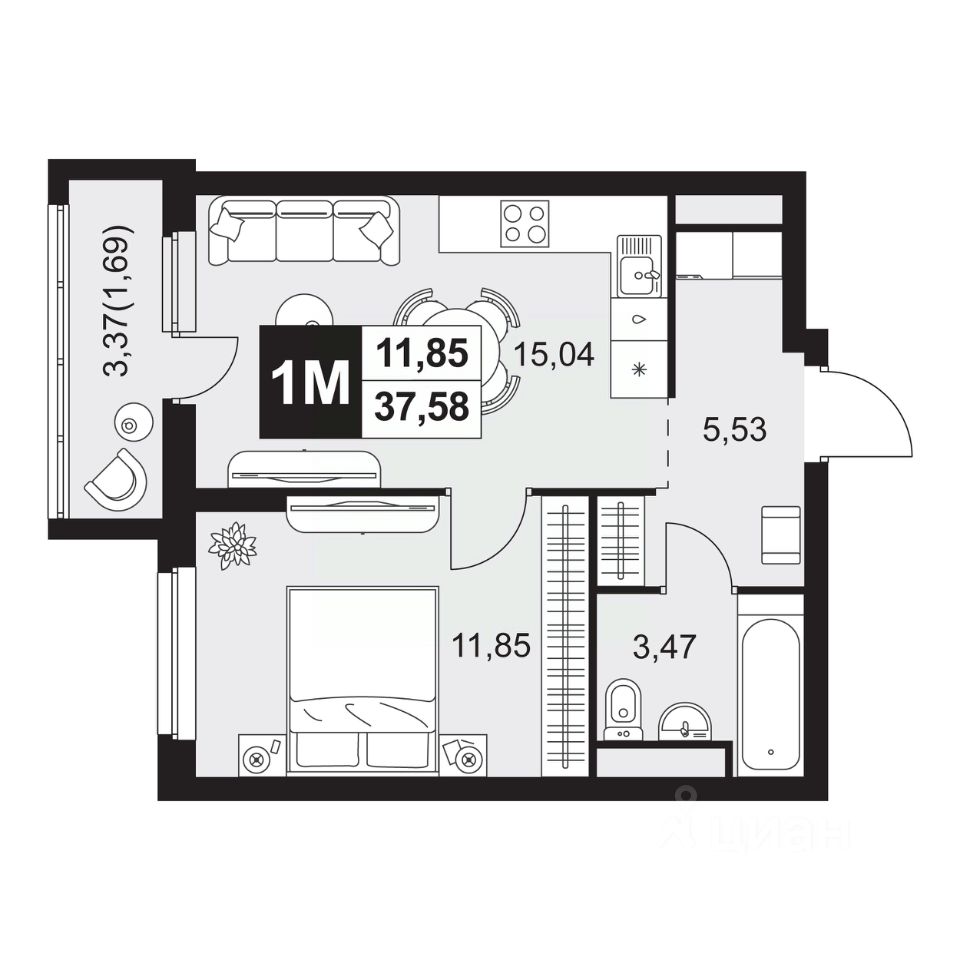 Общая площадь37,58 м²